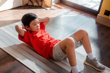 sportive asian boy doing abs on fitness mat at home during quarantine