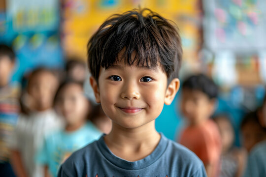 Preschooler in kindergarten, smiling Asian boy participating in classroom activities.