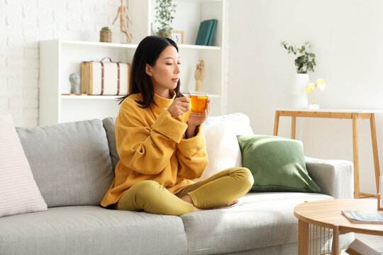 Beautiful young Asian woman with cup of tea sitting on sofa in living room