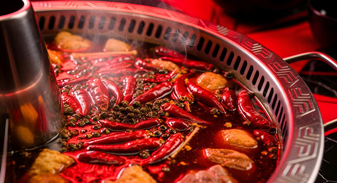 Close-up of a Sichuan Hot Pot with Red Chili Peppers and Boiling Broth