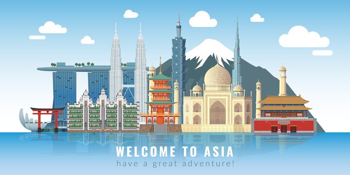 Asia skyline. Travel landmarks panoramic poster with text, historical and cultural buildings and attractions set, water reflect city, tourist excursions places vector banner
