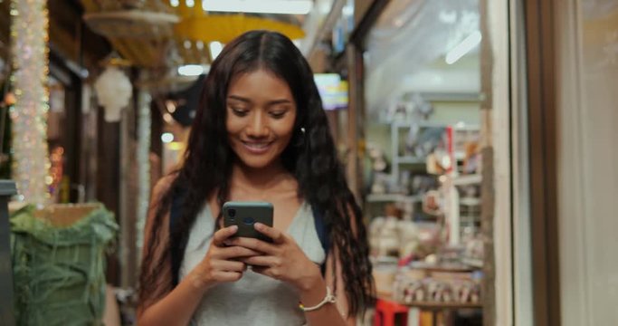 Beautiful female traveler shopping at street market alone. She walking at street market with attractive smile. 4K resolution.