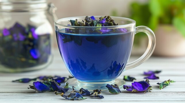 A cup of blue tea with flower petals in it. The cup is on a table with a jar of flowers next to it
