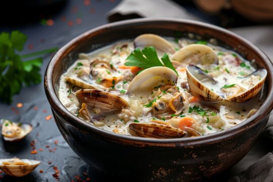 Savory flavorful bowl of seafood stew with clams and herbs in a creamy sauce