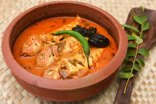 Kerala Masala fish curry in coastal area, Alappuzha south Indian and Sri Lanka, Malaysia. made by marinated mackerel fish, coconut milk,
