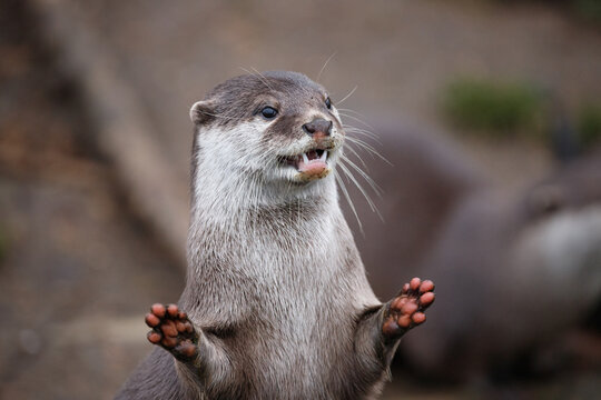 Asian small clawed otter standing on it's rear legs with it's hands outstretched.