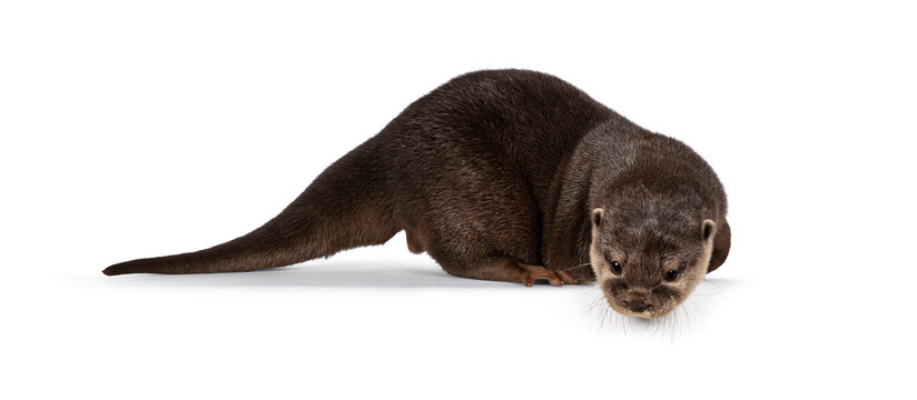 Cute young Asian small clawed otter aka Aonyx cinerea, standing side ways on edge. Looking down from edge towards camera. isolated on a white background.