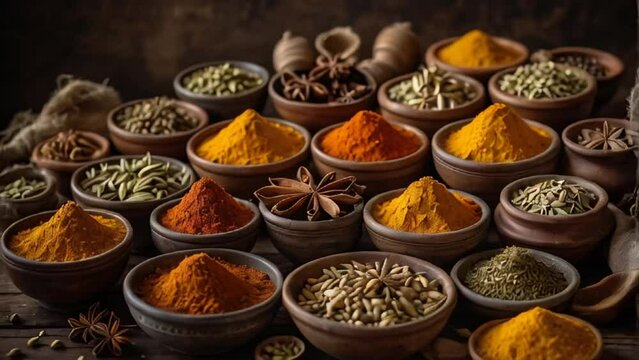 Aromatic and colorful spices in wooden bowls on a dark surface, ready to elevate your cooking.