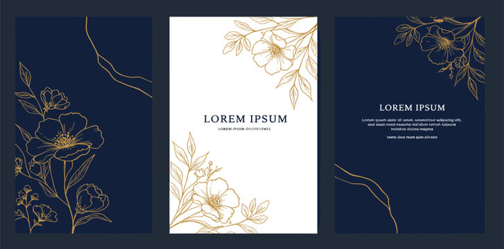 Vector set of flower golden art deco patterns, floral line package labels. Perfume, beauty products, jewelry package, wedding invitations, asian style nature