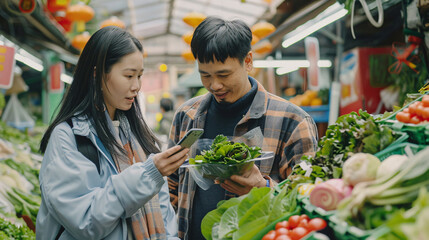 An Asian Female entrepreneur running her own organic vegetable stall, standing confidently at a fresh produce market with a display of fruits and vegetables in the background