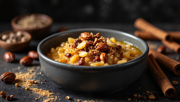 Aromatic asida with nuts in dark bowl
