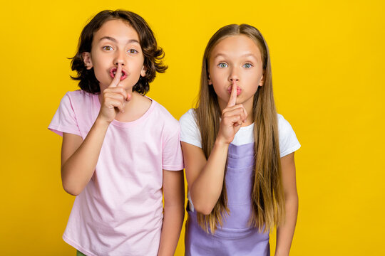 Photo of tricky cunning friends wear casual outfits finger lips asking keep silence isolated yellow color background