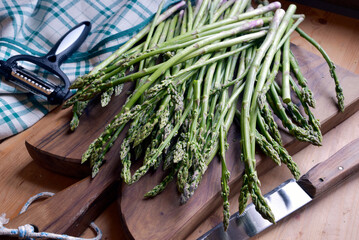 Garden bed with growing asparagus close-up. Mulching the soil with dry grass. Growing delicious vegetables in the home garden