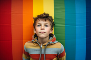 A child standing on front of rainbow colored wall. Child mental health concept. ASD, autism spectrum disorder awareness concept. Asperger's syndrome, early intervention.