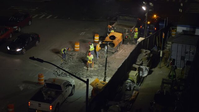 A road construction crew is breaking up cement on the street, preparing to make road work improvements.