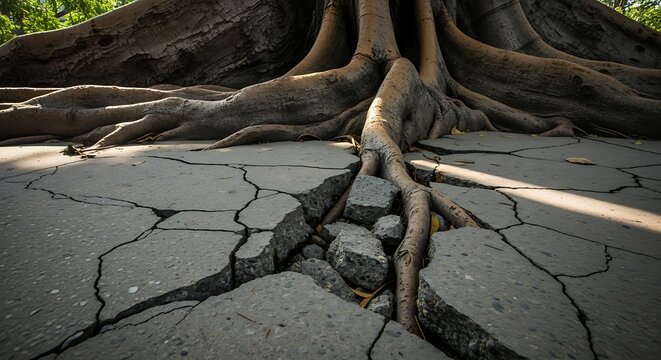 Large tree roots breaking and lifting a cracked asphalt surface, showcasing nature's power and urban decay.