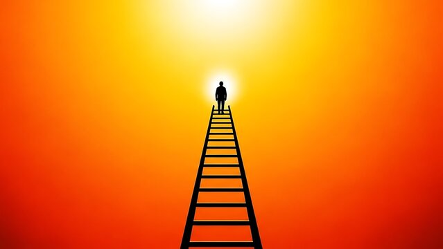 A person standing on a ladder reaching for success and achievement under a bright orange and yellow sky