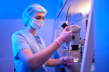 Focused female scientist aspirating reagent from vial