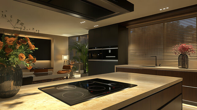 Elegant contemporary loft kitchen featuring a black glass induction hob with built-in hood or an aspirating induction hob on marble light stoneware countertop panels and a flower vase