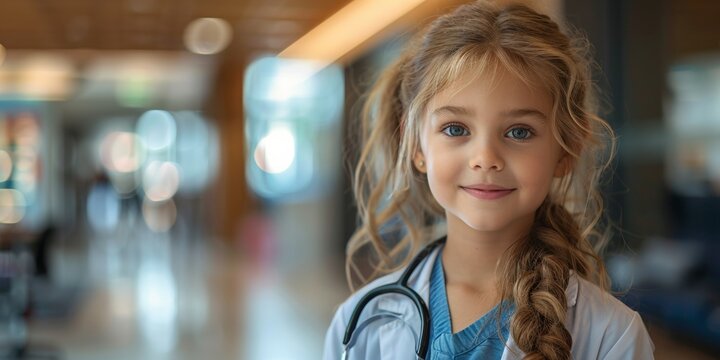 A pretty young girl in a hospital uniform holds a stethoscope, symbolizing aspirations in medicine