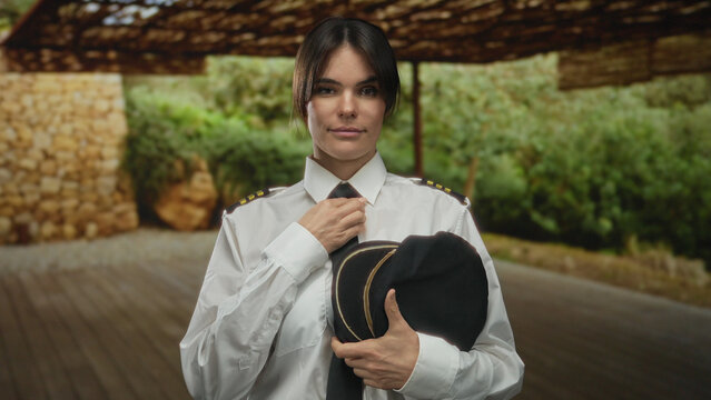 Young hispanic woman pilot in uniform holding cap, standing outdoors in an urban city street with greenery and rustic stone wall background on a bright day