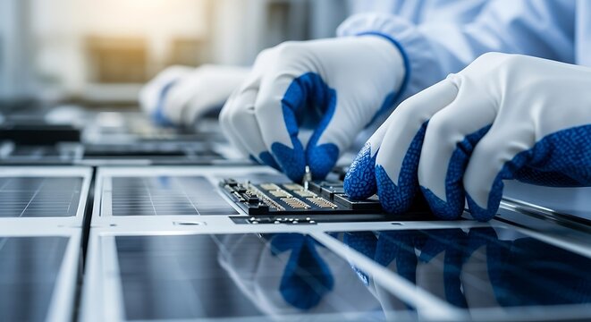 Solar Panel Assembly with Circuit Board and Gloved Hands