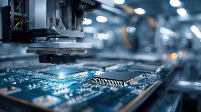 Close-up shot of a circuit board being tested or assembled in a factory setting