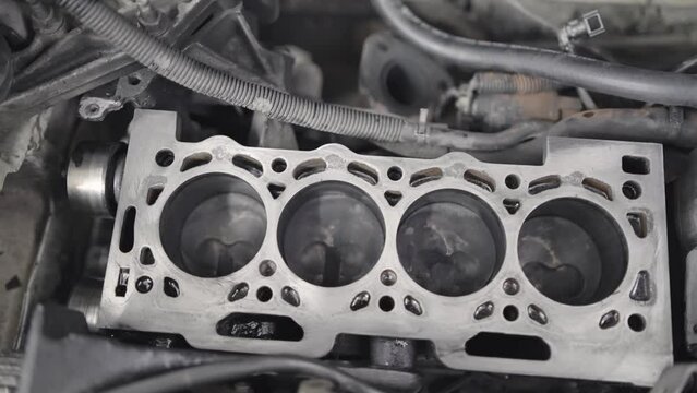 Working cycle of open block of four cylinder petrol engine in repair mechanic shop