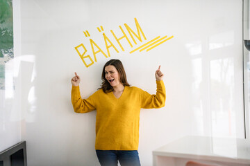 Creative businesswoman pointing at text in front of white wall with text in office
