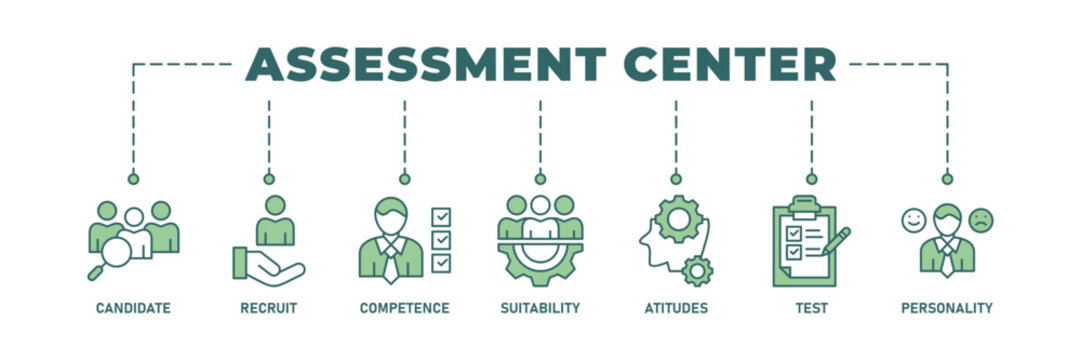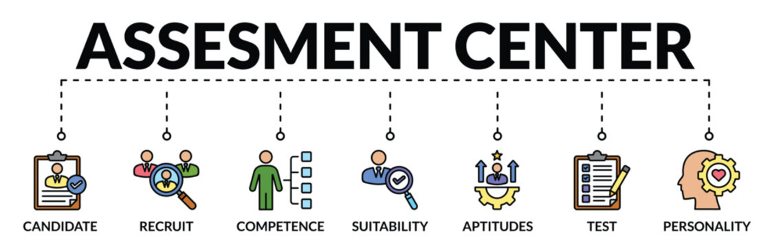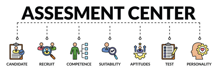 Banner of assessment center web vector illustration concept with icons of candidate, recruit, competence, suitability, aptitude, test, personality