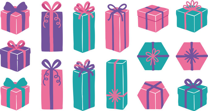 A Variety of Wrapped Gift Boxes Icons with Ribbons, Presented as a Collection of Line Drawings