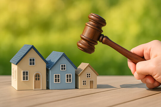 Conceptual Image of Property Law and Real Estate Market with Wooden Homes and a Judge's Gavel, Auction or Legal Verdict, Property Law, Real Estate Auctions, and Legal Housing Market Decisions