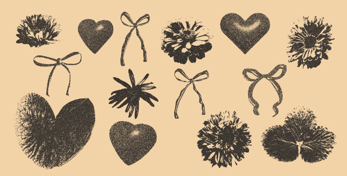 Flower and leaves photocopy collage stickers. Stippled monochrome effect florals and bows with hearts assets. Collage halftone botanical element. Vector dotted scrapbook illustration.