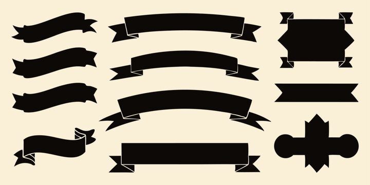 Collection of retro black silhouette design assets (ribbons, banners, etc.) on light background, column format.