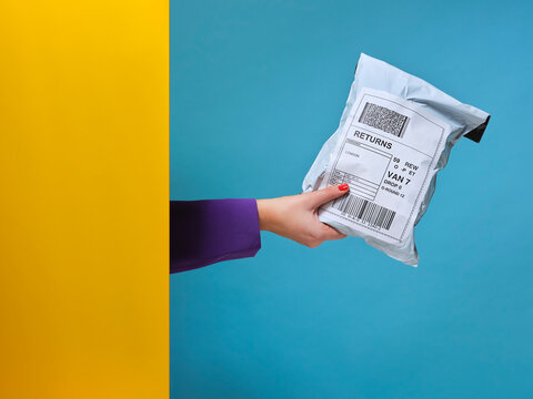 Caucasian young adult woman smiling while handing package to customer across counter in shipping or postal service office, shelves with parcels visible in background, barcode scanner on desk