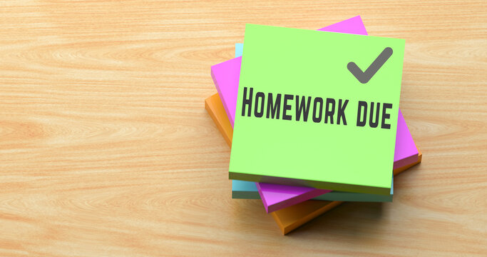 Homework due text on colorful sticky note on wooden desk, business absence reminder concept