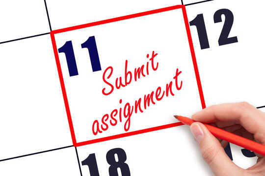 11 th day of the month.  Hand writing Submit assignment reminder and drawing red frame on calendar with red pen on white background. Business concept. Planning and scheduling