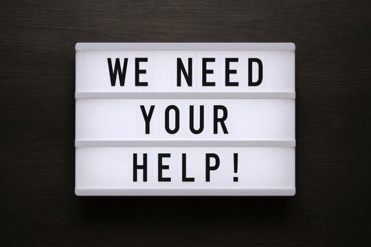 Illuminated Lightbox Displaying Message of Urgent Assistance Needed on Dark Background