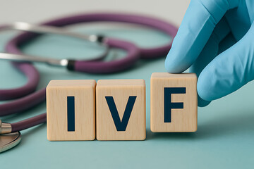 In vitro fertilization IVF concept with wooden letter blocks spelling IVF, stethoscope and medical gloves in background, reproductive health care, fertility treatment, assisted reproduction technology