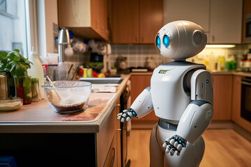Modern, friendly robot stands ready in a well-equipped kitchen, showcasing the seamless integration of advanced technology in everyday tasks like cooking and housework.