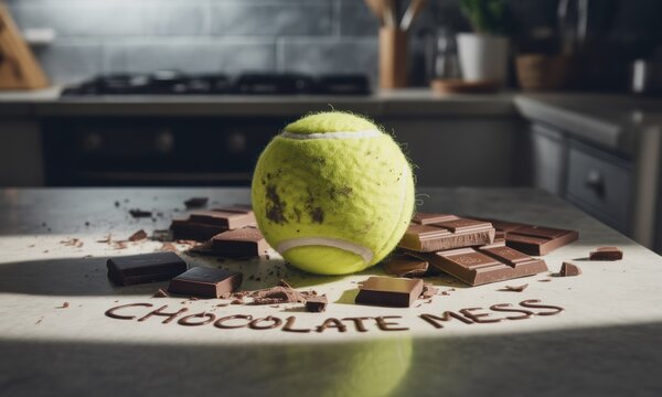 A tennis ball sits amidst a chocolate bar mess on a kitchen counter, with text below
