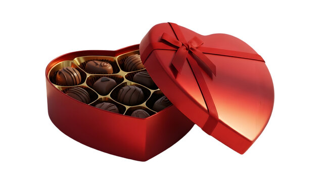 A heart shaped box of assorted chocolates tied with a red ribbon sits open displaying the tempting treats inside