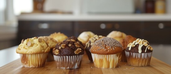 A wooden table is filled with a variety of cupcakes and muffins, each distinct in flavor and decoration. The baked goods are neatly arranged, showcasing their delicious and tempting appearance.