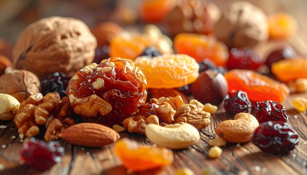 Close-up of assorted dried fruits and nuts arranged on a wooden surface