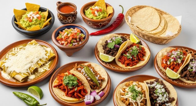 Delicious Mexican food assortment with tacos, guacamole, and salsa