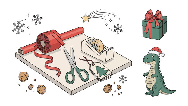 Holiday Prep: A festive assortment of Christmas elements arranged in a cheerful display, including a wrapped present with bow, snowflakes, ribbons, ornaments and cookies.