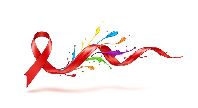Red ribbon with colorful splashes on a white background for aids awareness and support campaign