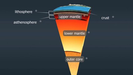 Lithosphere vector drawing. Structure of the Earth, Labeled educational earth outer shell diagram. Explanation section diagram with asthenosphere, mantle and core structure.