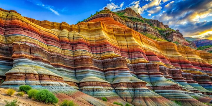 Vibrant multi-colored geological layers exposed in a rugged cliff face, showcasing ancient history of erosion and sedimentation in a majestic natural rock formation landscape.