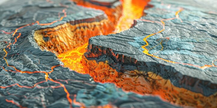 Close-up view of tectonic plate interactions in Earth's crust and upper mantle displaying geological processes and molten activity